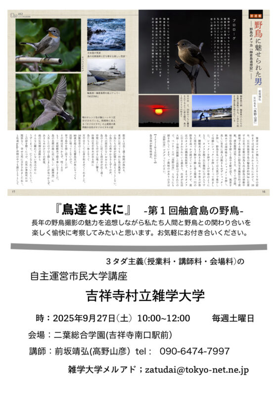 続きを読む単純に「あけおめ」とは言えないほどの、 今日夕方4時過ぎ発生した、「令和6年能登半島地震」の マグニチュード7.6の激震は東京の自宅のリビングで座っていても 揺れを感じるほどの大きなものでした。 能登半島の最大5mの大津波や舳倉島への野鳥探訪の際、毎年お世話になっていた 輪島市中心部の民宿の所在地ー河井町が大火に見まわれたnewsを 知ると、今日着いた年賀状を見ながら電話連絡しても通じません。 どうかご無事でと祈るのみです。 今日は地元の鳥友方と新年のご挨拶のため、いつものf […]